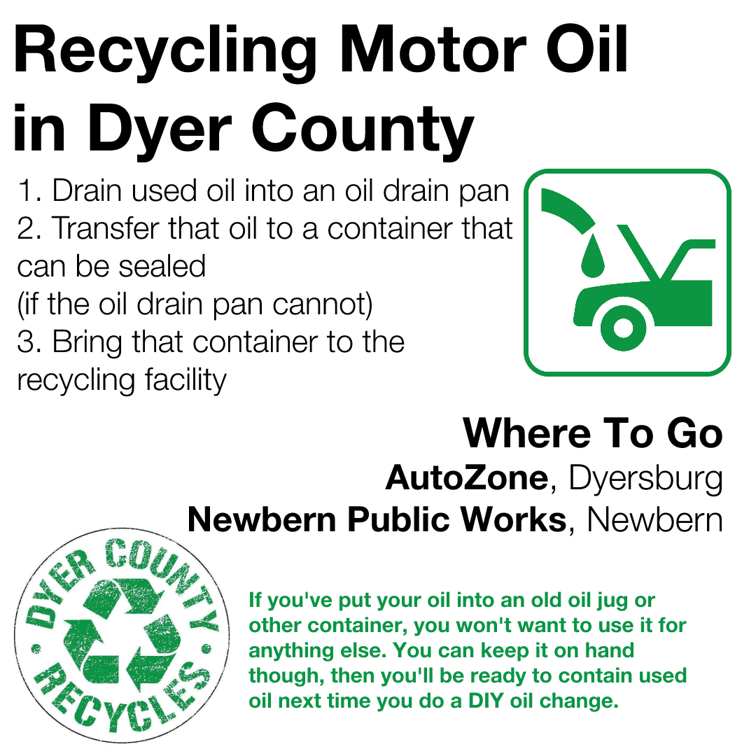 - The first step to recycling your oil is containing it and getting it ready for transportation. If you use a closed oil drain pan, you can finish both of these steps at the same time. If your oil drain pan cannot be closed, you'll want to transfer the oil to another container, like the jug the new oil came in.